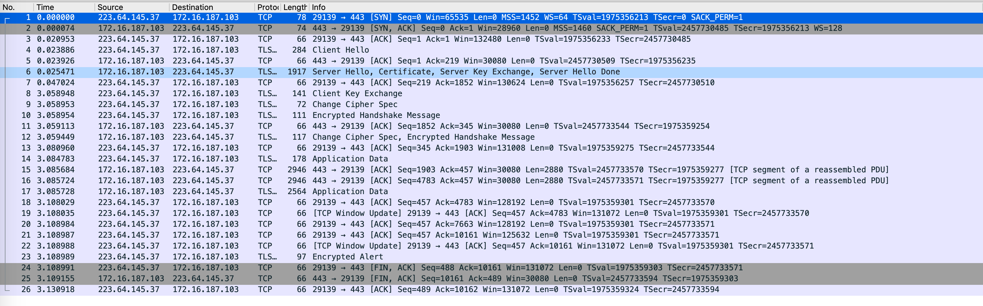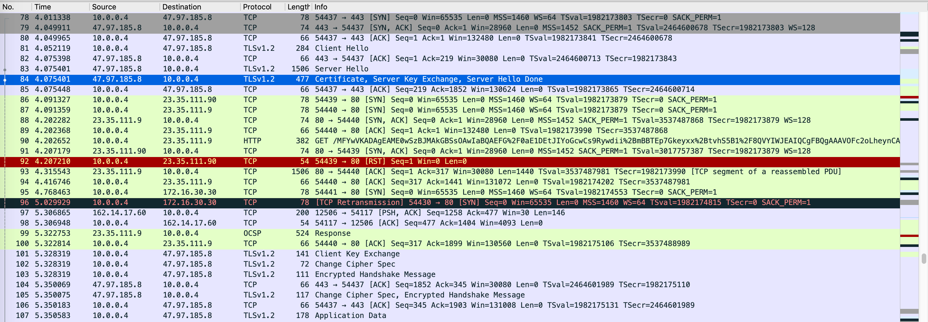 用 Wireshark 打开 pcap 文件,不用说 123 行就是 TCP 三次握手,出现明显延迟的地方在第 8 行,也就是 SSL 握手过程中交换客户端密钥的步骤。