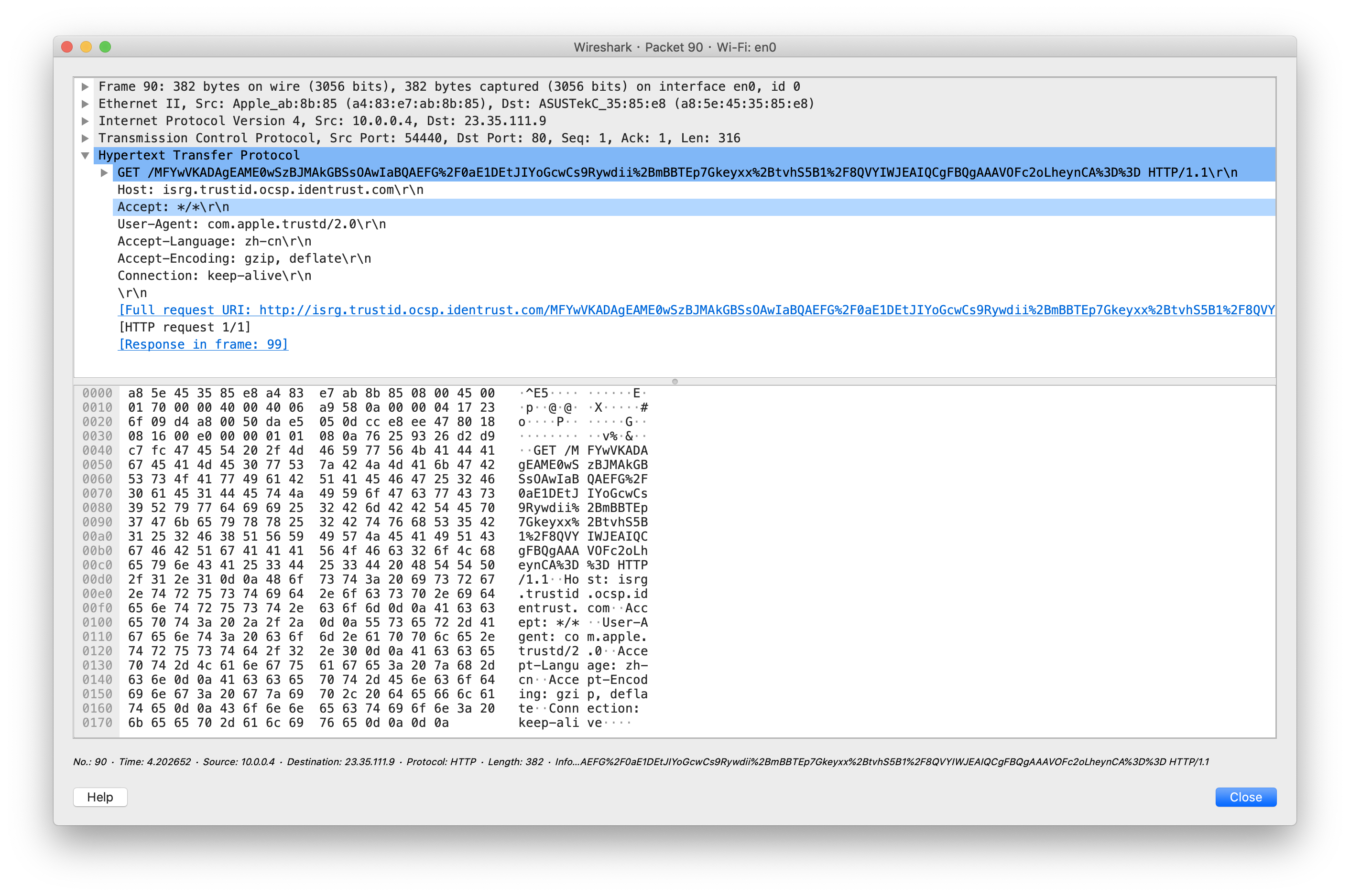 发现客户端在拿到博客服务器发来的证书链后与 isrg.trustid.ocsp.identrust.com 有数据交互,去来花了 1 秒多,而 OSCP 正是用来实时查询证书状态的协议,这个过程造成了非常大的延迟。