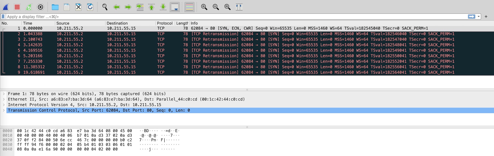 curl http://10.211.55.15:80/$ tcpdump -i eth0 tcp and port 80 tcpdump: verbose output suppressed, use -v or -vv for full protocol decode listening on eth0, link-type EN10MB (Ethernet), capture size 262144 bytes tcpdump -i eth0 tcp and port 80 tcpdump: verbose output suppressed, use -v or -vv for full protocol decode listening on eth0, link-type EN10MB (Ethernet), capture size 262144 bytes 10:24:18.281167 IP 10.211.55.2.61471 > iperror.shared.http: Flags [SEW], seq 4259795053, win 65535, options [mss 1460,nop,wscale 6,nop,nop,TS val 182086346 ecr 0,sackOK,eol], length 0 10:24:19.305082 IP 10.211.55.2.61471 > iperror.shared.http: Flags [S], seq 4259795053, win 65535, options [mss 1460,nop,wscale 6,nop,nop,TS val 182087346 ecr 0,sackOK,eol], length 0 10:24:20.339621 IP 10.211.55.2.61471 > iperror.shared.http: Flags [S], seq 4259795053, win 65535, options [mss 1460,nop,wscale 6,nop,nop,TS val 182088346 ecr 0,sackOK,eol], length 0 10:24:21.363671 IP 10.211.55.2.61471 > iperror.shared.http: Flags [S], seq 4259795053, win 65535, options [mss 1460,nop,wscale 6,nop,nop,TS val 182089346 ecr 0,sackOK,eol], length 0 10:24:22.396893 IP 10.211.55.2.61471 > iperror.shared.http: Flags [S], seq 4259795053, win 65535, options [mss 1460,nop,wscale 6,nop,nop,TS val 182090346 ecr 0,sackOK,eol], length 0 10:24:23.417779 IP 10.211.55.2.61471 > iperror.shared.http: Flags [S], seq 4259795053, win 65535, options [mss 1460,nop,wscale 6,nop,nop,TS val 182091346 ecr 0,sackOK,eol], length 0 10:24:25.471857 IP 10.211.55.2.61471 > iperror.shared.http: Flags [S], seq 4259795053, win 65535, options [mss 1460,nop,wscale 6,nop,nop,TS val 182093346 ecr 0,sackOK,eol], length 0