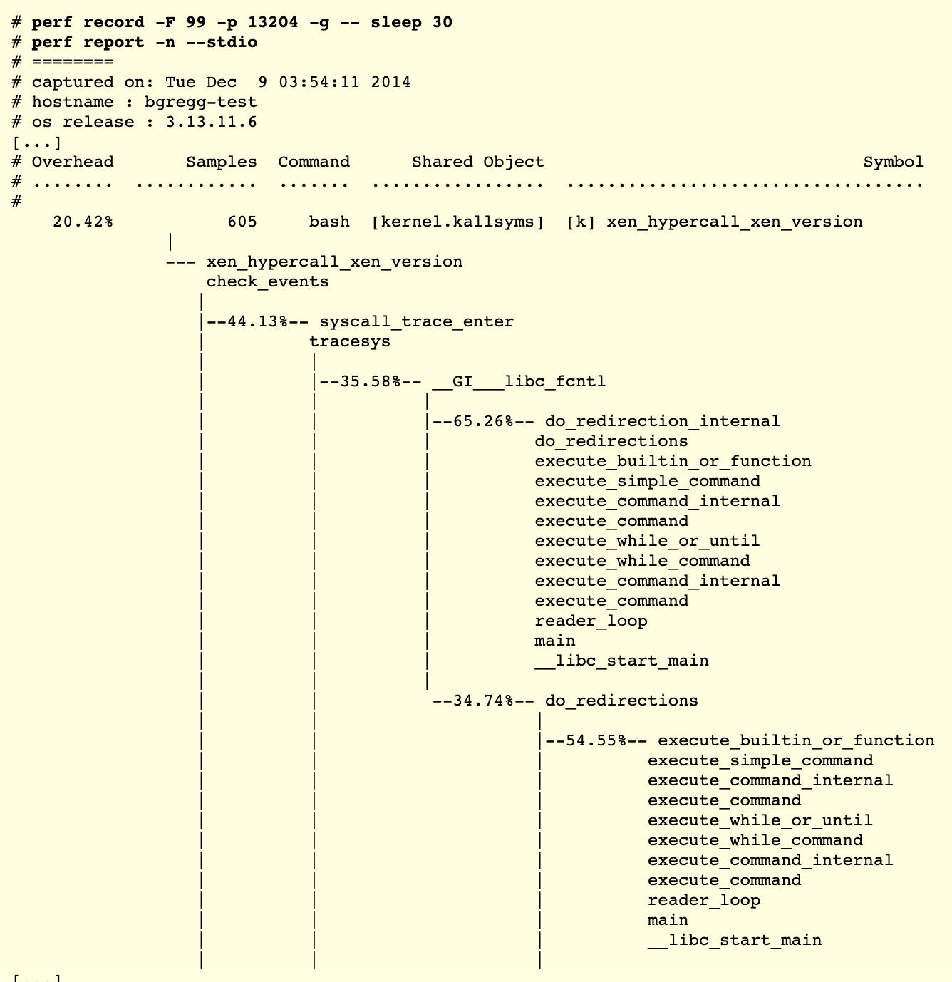 perf record 命令很好地将几百个堆栈回溯样本汇总为文本,合并了相似的代码路径,输出也给你安排成了树状结构,每片叶子上也都有百分比。从左上角到右下角,遵循了调用的路径(也就是堆栈追踪)。必须将从左乘到右才能算出整个堆栈的绝对百分比。